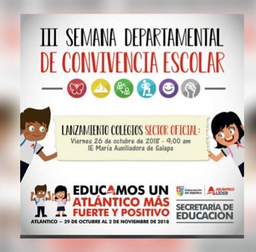 "EDUCAMOS UN ATLÁNTICO MÁS FUERTE Y POSITIVO " ; Del 29 de Octubre al 2 de Noviembre de 2018. Tanto la Básica Primaria como el Bachillerato organizrán actividades para reforzar valores establecidos en este programa. En esta semana se realizarán actividades enfocadas al desarrollo de competencias ciudadanas para la construcción de la convivencia pacífica en todo el territorio Atlanticense.