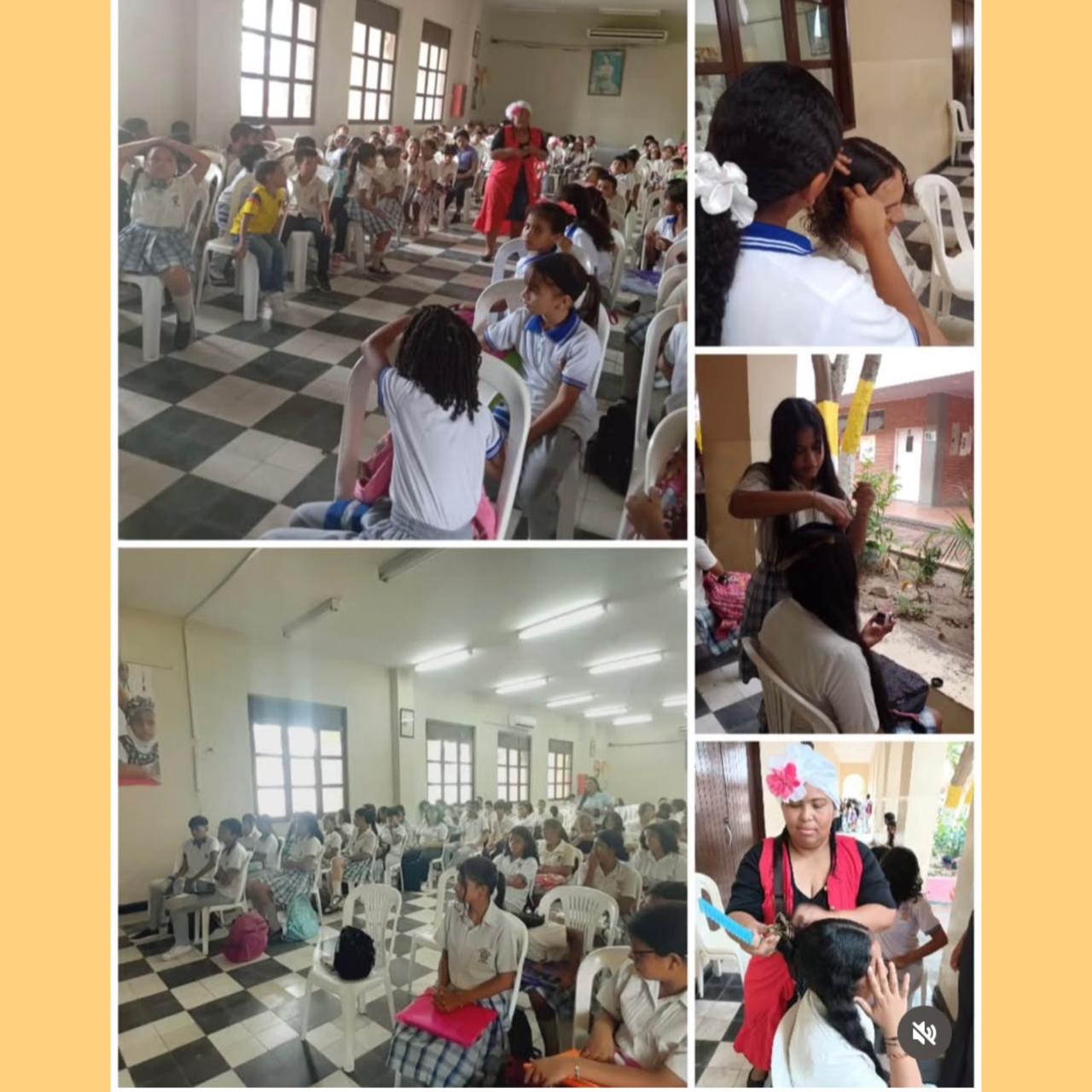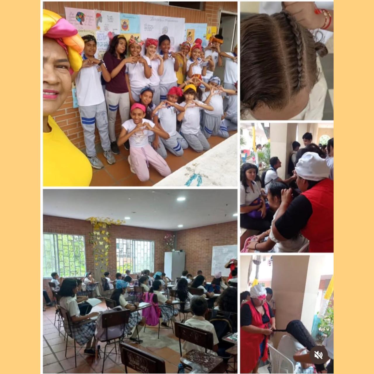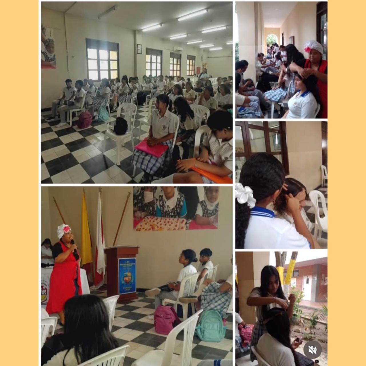 ⇔ Visita de mujeres trenzadoras en el salón de eventos de la institución educativa. “Tejidos de Paz".